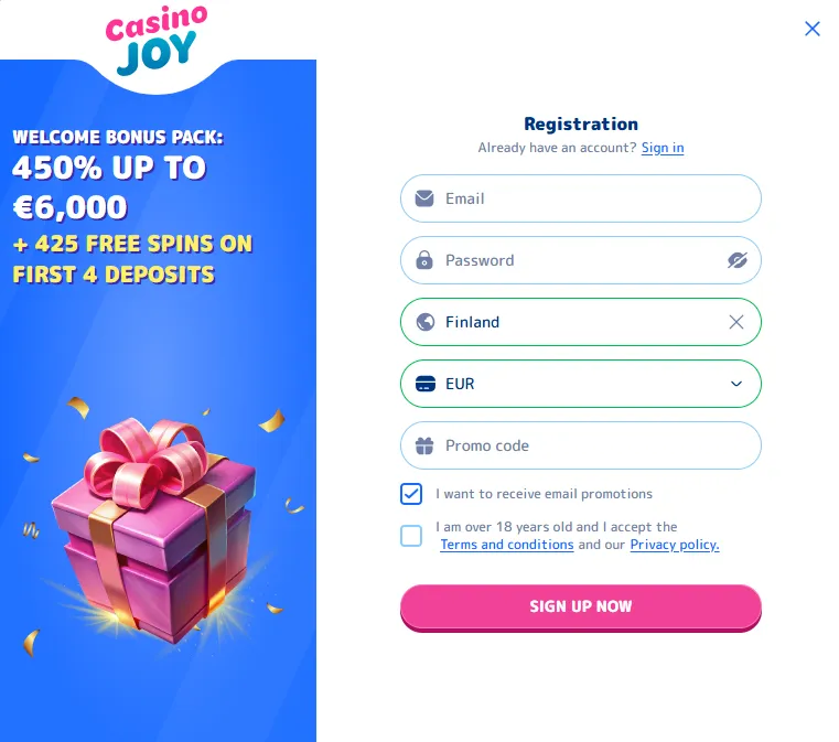 The second email you get, right after the one with the confirmation link, is Casinojoy’s welcome offers. Currently, the Welcome Package offers 450% Bonus up to €6,000 + 425 Free Spins on the first 4 Deposits.